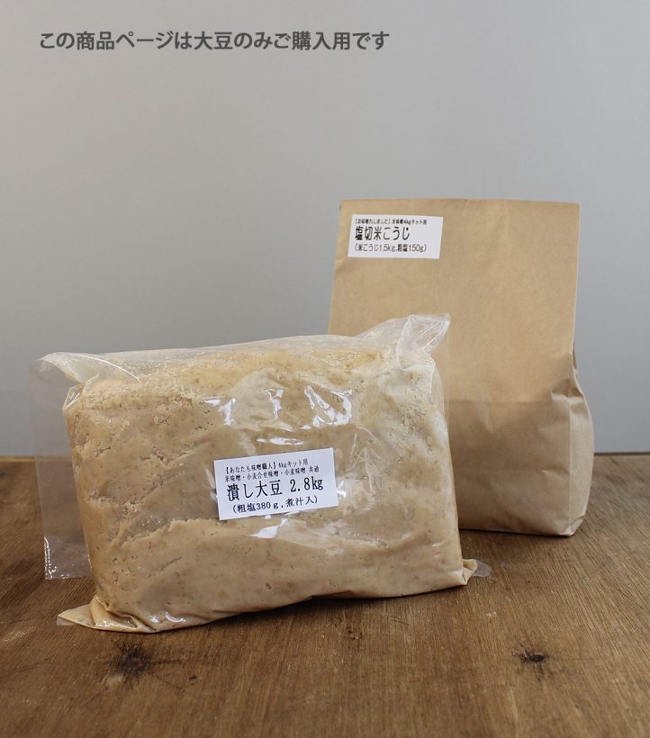 手造り味噌キット「あなたも味噌職人」(愛称:みそしょく)は、つぶし大豆、麹と塩のセットです。混ぜるだけでお味噌ができますので、味噌造り初めての方や、忙しい方におすすめです。